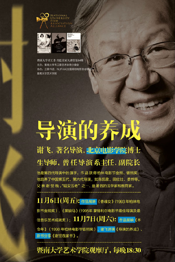 谢飞,当代著名导演,北京电影学院教授,博士生导师,曾任导演系主任、副院长。父亲谢觉哉,“延安五老之一”。作为导演,谢飞是第四代导演中的旗手,代表作品《香魂女》、《本命年》分别获得柏林电影节金熊、银熊奖;作为教师,他培养了中国第五代、第六代导演,如陈凯歌、田壮壮、娄烨等。