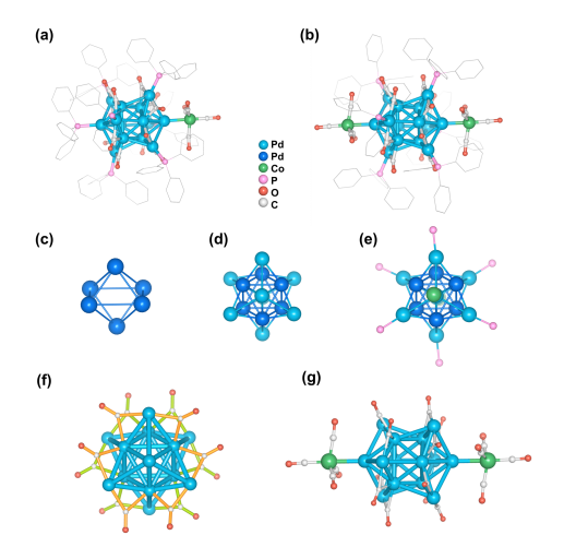 单晶X-射线衍射研究表明,Pd14纳米团簇的核心呈八加帽八面体构型(Pd6@Pd8),表面的两个[Co(CO)4]⁻配体通过顶端配位模式锚定Pd14两端。ESI-MS、XPS和SQUID等谱学表征联合DFT理论计算同步证实,Pd14团簇基态下为四重态(自旋多重度S = 3/2),并表现出罕见的开壳层超原子特征,其jellium电子构型为1S1。更重要的是,价键结构分析表明,团簇表面存在极性的Pd(δ-)–Co(δ+)键,[Co(CO)4]⁻配体与Pd14金属核间亦存在多重轨道相互作用(Co→Pd σ、π、δ配位键及δ反馈键),这种CO辅助的双金属成键模式赋予了团簇稳定性。