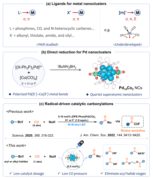 有鉴于此,暨南大学袁尚富/吴涛/李丹教授团队联合宁夏大学魏建宇副教授,提出了羰基金属配体调控钯还原动力学过程的创新合成策略,利用[Co(CO)₄]⁻阴离子配体成功构筑了具有“开壳层超原子”特性的Pd14纳米团簇,并将其应用于常压CO参与的可见光催化有机底物的羰基化反应。