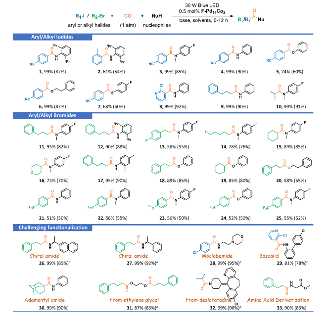 其中,F-Pd14Co2团簇在可见光驱动下表现出卓越的羰基化反应催化活性。在1 atm CO和30 W 450 nm LED灯的反应条件下,该催化体系实现了各类具有挑战性的芳基和烷基卤化物(包括一级、二级和三级烷基溴化物)与惰性亲核试剂(如伯/仲芳香胺、醇、酚和硫酚)高效偶联,制备了酰胺、酯和硫酯等30多例高附加值羰基化衍生物。此外,该催化剂还适用于复杂天然分子的衍生化和生物活性药物的目标合成,例如单胺氧化酶抑制剂moclobemide和抗真菌剂boscalid等。反应机理研究表明,该催化过程涉及金属协同的光诱导单电子转移。反应路径无需经历酰卤中间体的形成过程,这归功于钯纳米团簇末端[Co(CO)4]⁻基团可协助胺、醇等亲核试剂的活化,同时降低其亲核进攻能垒。