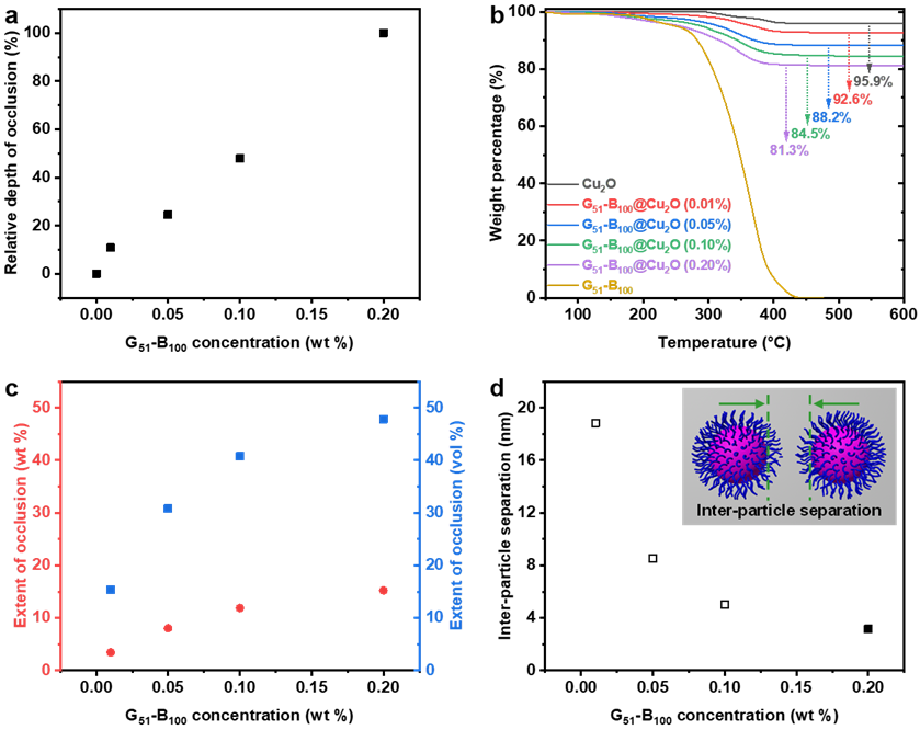图4.G51-B100在Cu2O晶体中的内嵌量分析。(a)G51-B100纳米粒子在Cu2O晶体中的相对内嵌深度与G51-B100浓度的关系,(b)TGA分析,(c)G51-B100内嵌量与G51-B100浓度的关系,(d)平均粒子间距与G51-B100浓度的关系。