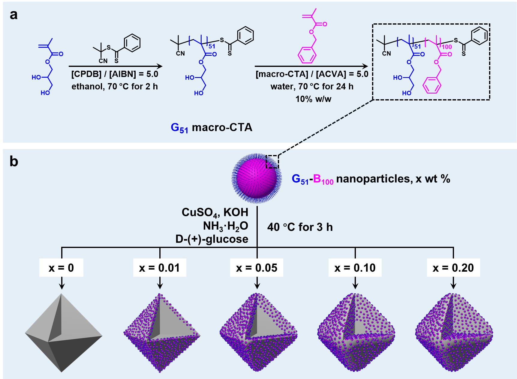 图2. G51-B100纳米粒子在Cu2O晶体中空间可控内嵌的示意图。(a)通过可逆加成-断裂链转移(RAFT)聚合介导的聚合诱导自组装(PISA)合成G51-B100纳米粒子;(b)通过调控G51-B100纳米粒子的用量系统调控其在Cu2O晶体中的内嵌深度。