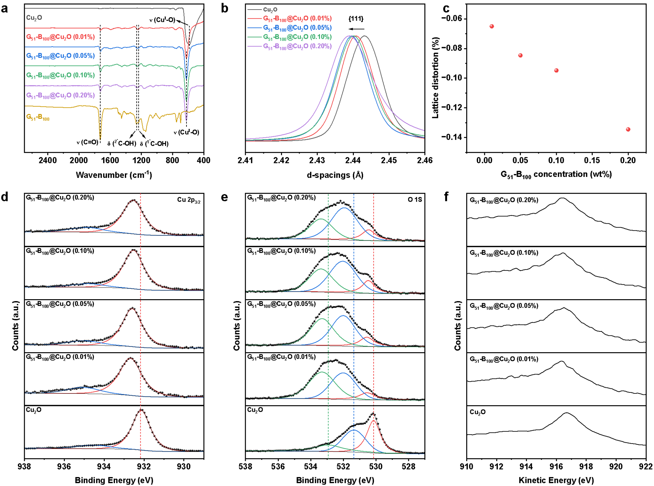 图5.G51-B100@Cu2O复合晶体的微观结构分析。(a)FT-IR光谱,(b)高分辨同步辐射粉末XRD显示晶格收缩,(c)晶格畸变与G51-B100浓度的关系,(d-e)Cu 2p3/2和O 1s的XPS光谱,(f)Cu LMM谱。