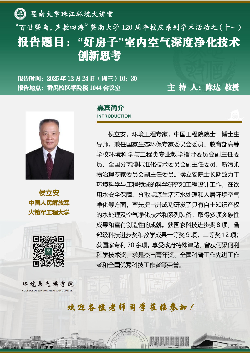 【百廿暨南,声教四海】校庆系列学术活动(十一)——中国工程院院士侯立安:“好房子”室内空气深度净化技术创新思考
