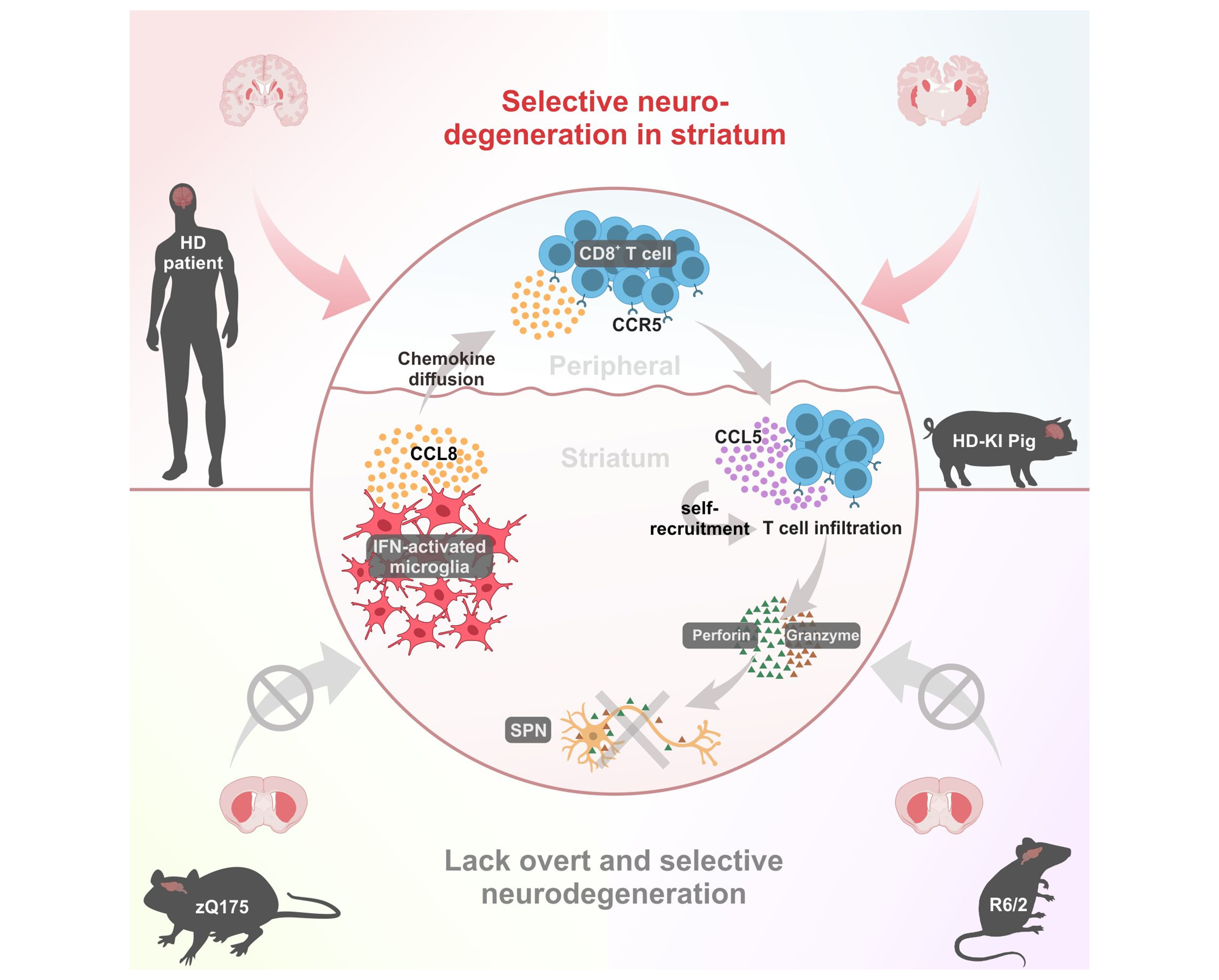 机制研究表明,浸润的CD8⁺ T细胞表达CCR5受体,并通过CCL8-CCR5趋化轴被招募至病变纹状体区域,该过程由HD中激活的IFITM3⁺小胶质细胞亚群分泌的CCL8趋化因子所介导。浸润的CD8+T细胞在纹状体中通过释放穿孔素和颗粒酶诱导神经元变性,从而加剧HD神经退行性病变。尽管在HD-KI小鼠中未观察到内源性CCL8上调和CD8+T细胞浸润,外源性CCL8过表达却足以在其纹状体中诱发CD8⁺ T细胞浸润并发生神经元丢失,提示物种特异性小胶质细胞反应可能调控T细胞的中枢浸润。