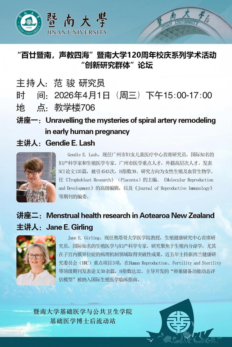 【百廿暨南,声教四海】校庆系列学术活动(三十)——Unravelling the mysteries of spiral artery remodelingin early human pregnancy; Menstrual health research in Aotearoa New Zealand