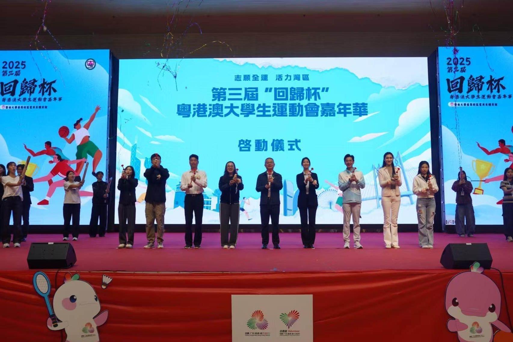 恰逢粤港澳三地共同举办十五运会和残特奥会之年,第三届“回归杯”承载着特殊的历史意义与时代使命。活动以体育为媒、文化为桥,不仅为三地学子提供了展示运动才华和青春创意的舞台,更构筑了三地学子增进情感认同、促进文化认同的桥梁。大家以志愿之名参与其中,用汗水传递运动热情,既展现了三地青年的蓬勃朝气,也透着粤港澳大湾区富有活力、深度交融的无限魅力。