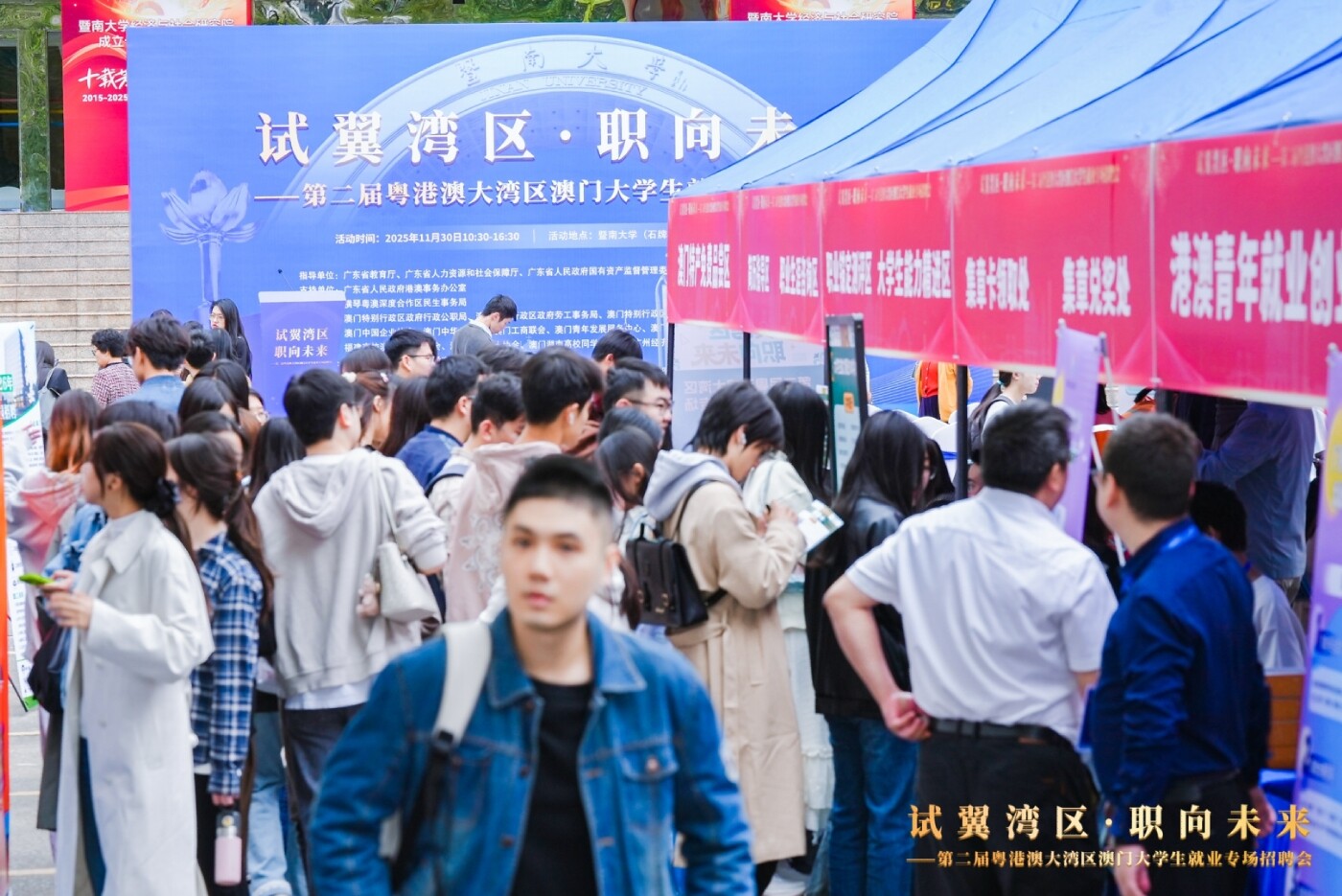 11月30日,“试翼湾区·职向未来——第二届粤港澳大湾区澳门大学生就业专场招聘会”在暨南大学石牌校区落幕。各级部门联动高校,以线上线下招聘结合、直播带岗、就业政策宣传、职业指导、趣味游戏互动、澳门特产美食品鉴等丰富多样的形式开展就业服务活动,线上线下参会学生近9000人次,观看直播带岗近8000人次。