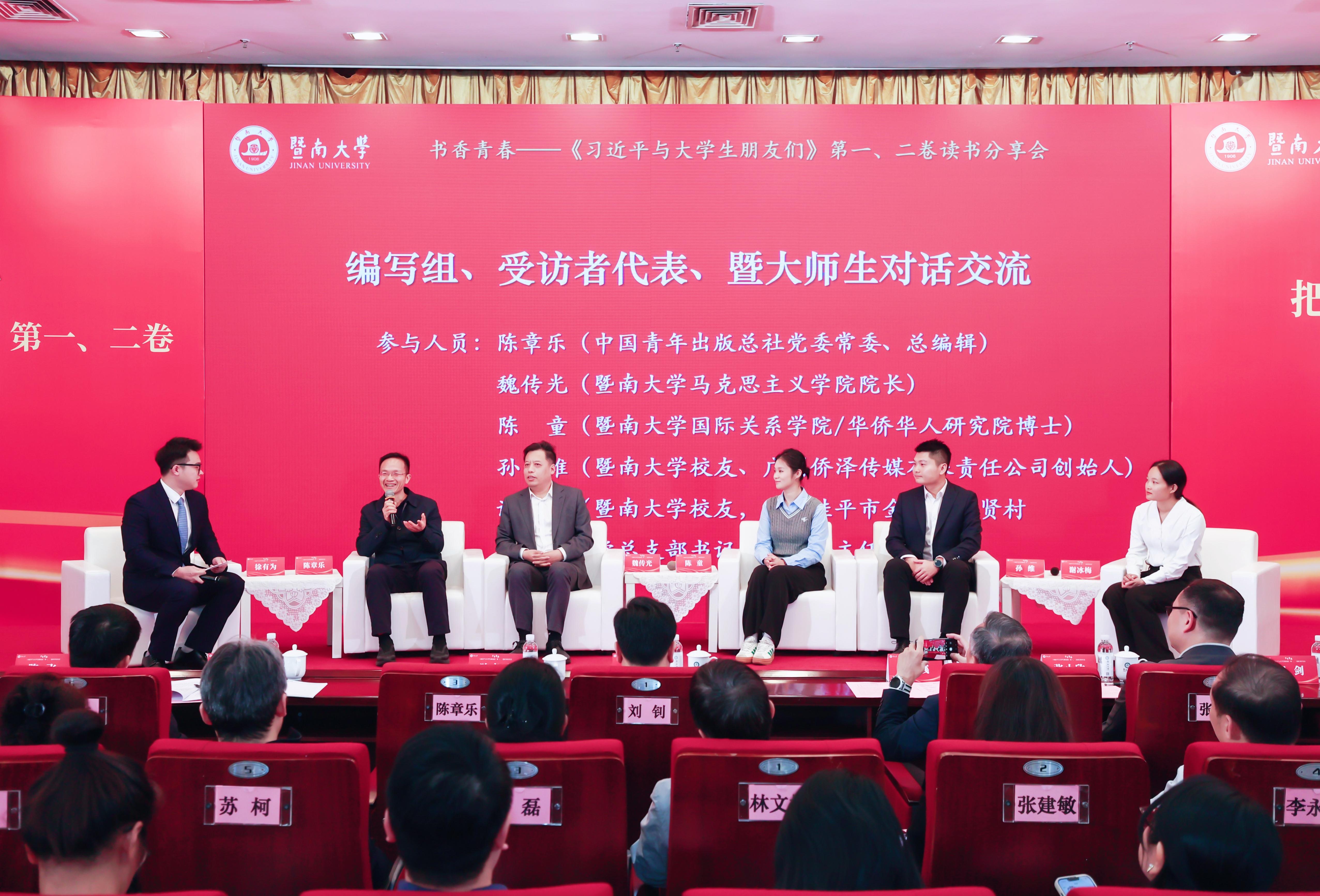 在交流环节,编写组成员、受访者代表与师生展开深度对话。中国青年出版总社党委常委、总编辑陈章乐勉励暨南青年要珍惜青春时光,勤奋学习,助力中国腾飞。暨南大学马克思主义学院院长魏传光表示,《习近平与大学生朋友们》是开展高校思想政治工作的优秀教材,将持续结合该书做好思政课教学。“全国三八红旗手”、校友代表谢冰梅分享了返乡奉献的动人选择,广州侨泽传媒有限责任公司创始人、校友代表孙维和国际关系学院/华侨华人研究院2023级博士研究生陈童重温了受习近平总书记接见的激动时刻,并分享了七年间各自的成长故事。