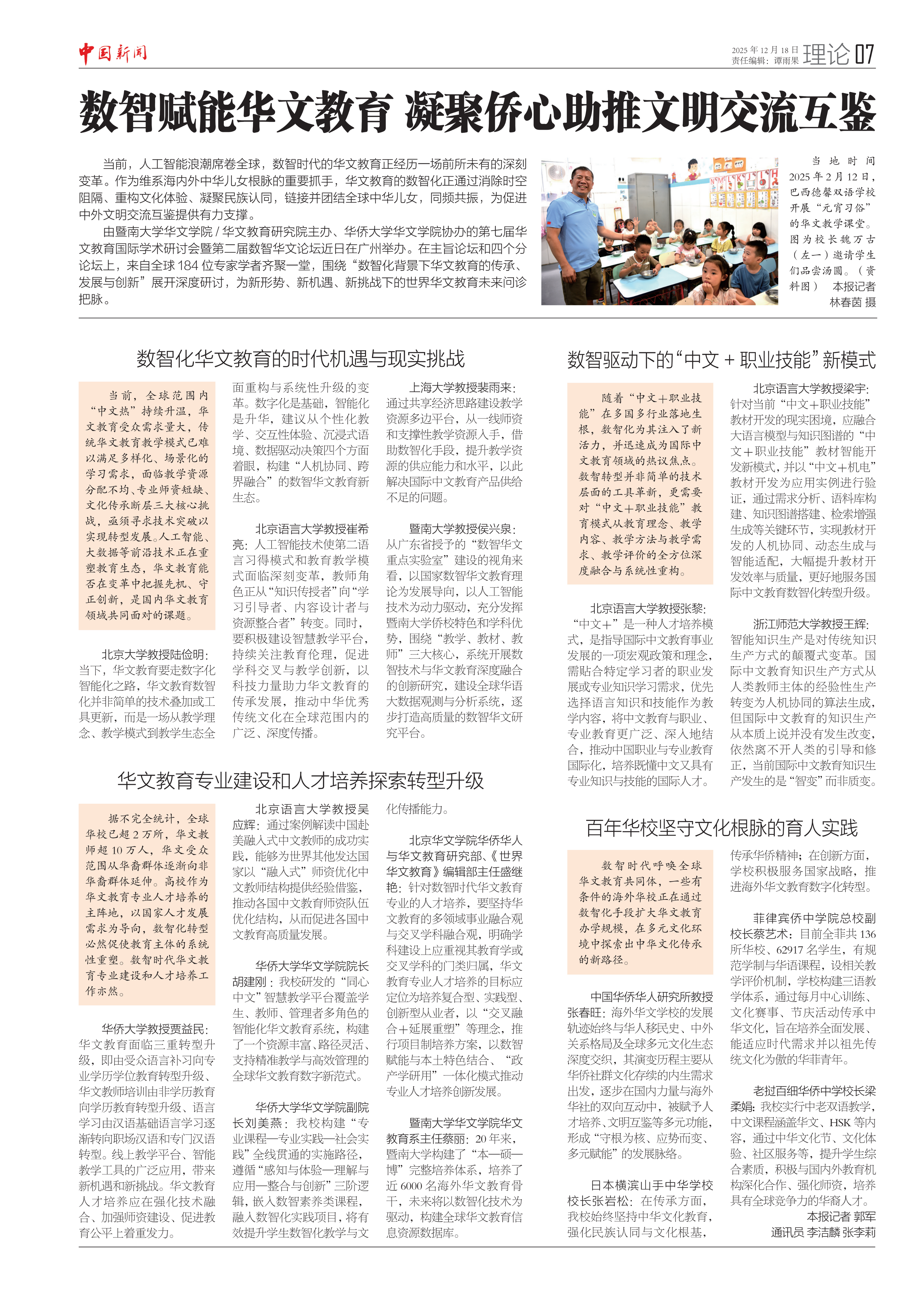 华侨大学教授贾益民:华文教育面临三重转型升级,即由受众语言补习向专业学历学位教育转型升级、华文教师培训由非学历教育向学历教育转型升级、语言学习由汉语基础语言学习逐渐转向职场汉语和专门汉语转型。线上教学平台、智能教学工具的广泛应用,带来新机遇和新挑战。华文教育人才培养应在强化技术融合、加强师资建设、促进教育公平上着重发力。