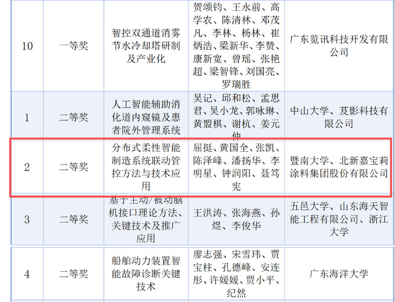 暨南大学融媒体中心讯 近日,广东省科技成果转化促进会公布了2025年度科学技术奖获奖项目名单,由暨南大学智能科学与工程学院/人工智能产业学院屈挺教授团队与北新嘉宝莉涂料集团股份有限公司联合申报的“分布式柔性智能制造系统联动管控方法与技术应用”项目获批科技成果创新奖二等奖。该奖项为校区首次获得,标志着校区在产学研协同创新与科技成果转化方面取得新的突破。