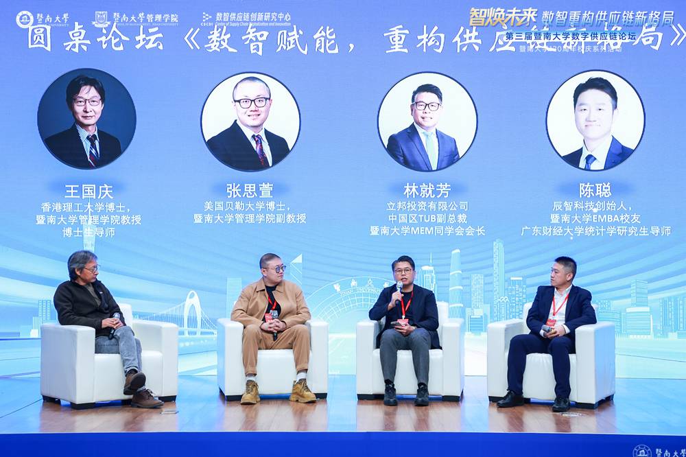 圆桌论坛由暨南大学管理学院教授王国庆和副教授张思萱共同担任主持人。暨南大学MEM校友、立邦投资有限公司中国区TUB副总裁林就芳介绍了企业面临宏观外部环境变迁的应对策略,并指出数智技术显著提升海外布局供应基地的反应速度与灵活性。暨南大学EMBA校友、辰智科技创始人陈聪指出中国企业在数字化体系建设与技术创新方面已积累深厚基础,大语言模型正逐步形成具有中国特色的智能化解决方案。