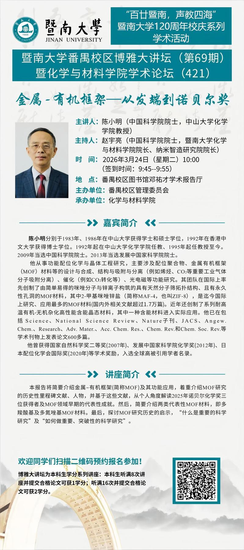 【百廿暨南,声教四海】校庆系列学术活动(二十二)——中国科学院院士陈小明:金属-有机框架—从发端到诺贝尔奖