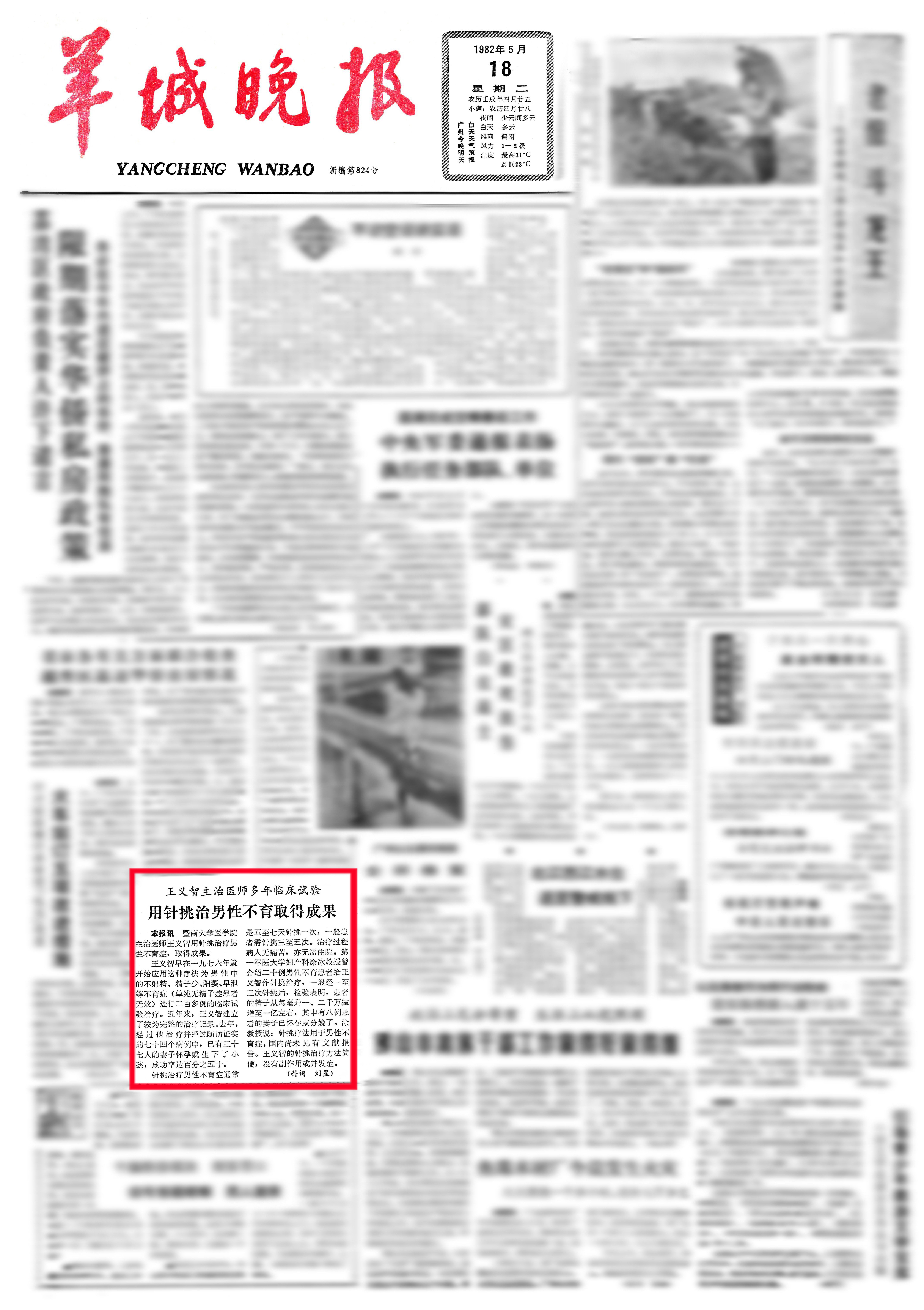 岭南陈氏针挑法与羊城晚报的渊源,早在44年前就已结下。1982年5月18日,羊城晚报头版刊发《王义智主治医师多年临床试验 用针挑治男性不育取得成果》,独家报道了这项中西医结合技艺的诊疗成果,在全国引发强烈轰动。